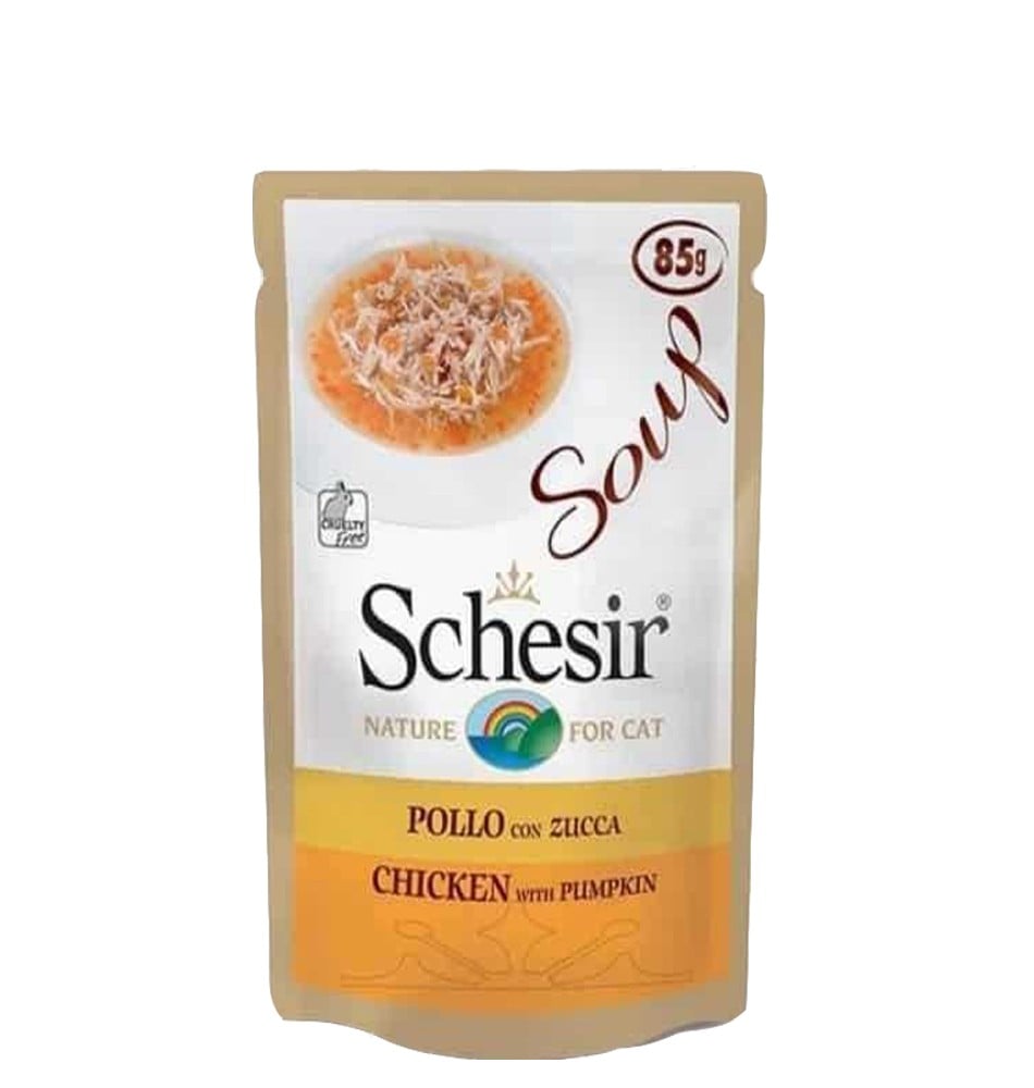 غذّي قطتك بشوربة دافئة ولذيذة من شيزر شوربة دجاج مع اليقطين، طعام خفيف غني بالفائدة والطعم.