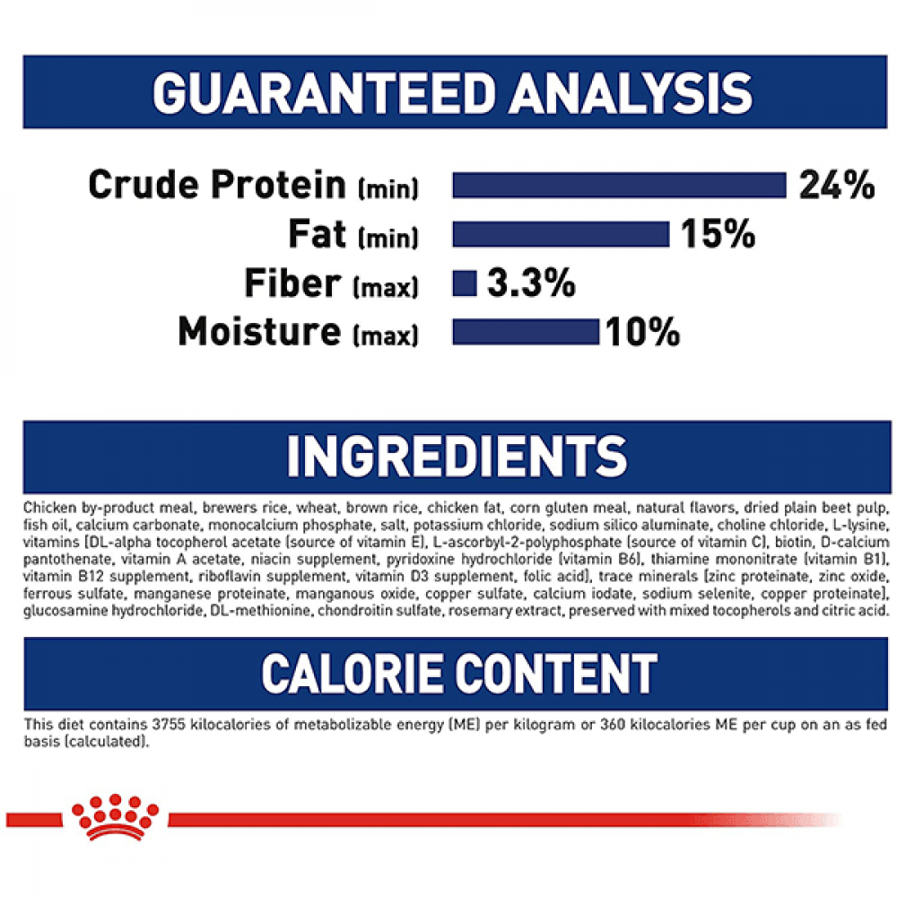 وجبة منتج ثانوي للدجاج ، أرز بيرة ، قمح ، أرز بني ، دهون دجاج ، وجبة جلوتين الذرة ، نكهات طبيعية ، لب البنجر العادي المجفف ، زيت السمك ، كربونات الكالسيوم ، فوسفات أحادي الكالسيوم ، ملح ، كلوريد البوتاسيوم ، ألومينات الصوديوم ، كلوريد الكولين ، L-lysine ، فيتامينات [DL-alpha tocopherol acetate (مصدر لفيتامين E) ، L-ascorbyl-2-polyphosphate (مصدر لفيتامين C) ، البيوتين ، D- بانتوثينات الكالسيوم ، أسيتات فيتامين أ ، مكمل النياسين ، هيدروكلوريد البيريدوكسين (فيتامين ب 6) ، أحادي نترات الثيامين (فيتامين ب 1) ، مكمل فيتامين ب 12 ، مكمل الريبوفلافين ، مكمل فيتامين د 3 ، حمض الفوليك] ، المعادن النادرة [بروتينات الزنك ، أكسيد الزنك ، كبريتات الحديدوز ، بروتين المنغنيز ، أكسيد المنغنيز ، كبريتات النحاس ، يودات الكالسيوم ، الصوديوم سيلينيت ، بروتين نحاسي] ، جلوكوزامين هيدروكلوريد ، DL- ميثيونين ، كبريتات شوندروتن ، مستخلص إكليل الجبل ، محفوظ بمزيج من التوكوفيرول وحمض الستريك